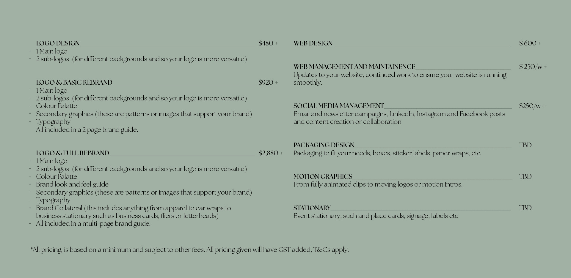 Client needs vary so much, because of this, here is a basic guide of my services and what I can do to best fit the needs of your brand/company.